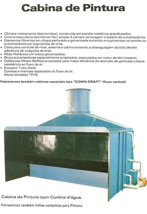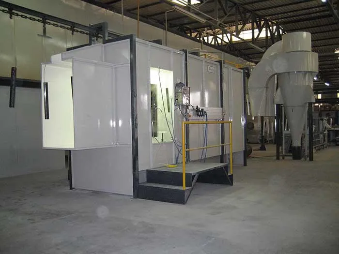 A cabine a pó também tem suas características próprias de pintura, fluxo de ar, filtragem do ar contaminado com tinta, sistema de recuperação da tinta etc.