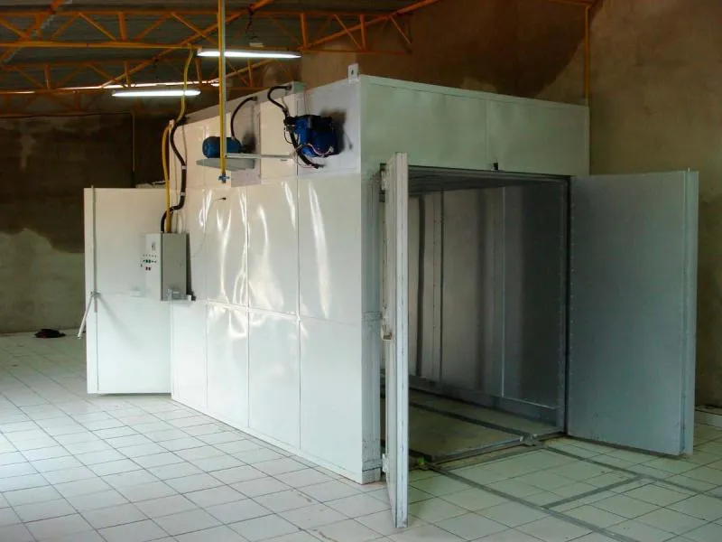A Estufa para pintura a pó tipo câmara é feito por portas de duas folhas, com acesso frontal, construídas em painéis de duplas chapas e isoladas com lã de rocha, a abertura e fechamento da porta é feito pelo próprio operador.