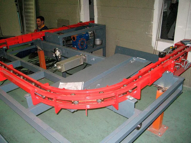 Outro tipo de motorização é com uma roda dentada acionada por motoredutor que engata diretamente na corrente do transportador, no layout ela pode estar montada em uma curva de 90º ou de 180º.